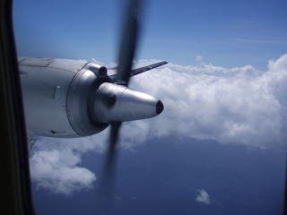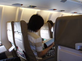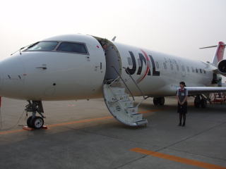 50人乗りの小型ジェット、ボンバルディアCRJ−200。革張りシートなのはいいが、天井は低く全体に狭い。オーディオのサービスもない。 CAは1人だけである。 |