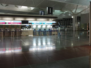 | 愛知万博後、セントレアに移されたライトフライヤーの実物大模型 | 夜9時を過ぎて、人気の無くなった航空会社のカウンター | |
