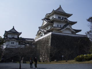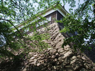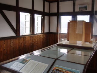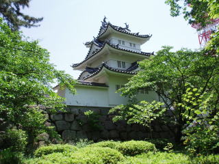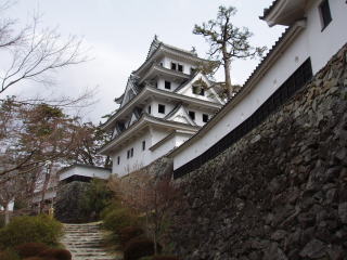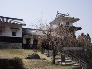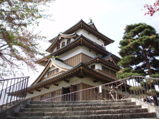 天守閣は昭和8年に木造で造られたもので、木造の再建としては日本最古。大垣城の天守をモデルに造られたらしい。 通常の木造天守は土足厳禁だが、ここは土足のまま上がるようになっている。 |