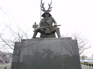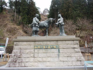 | 郡上八幡城 岐阜県郡上市にある山城。山内一豊の妻千代の出身地は諸説あるが、この郡上八幡出身説もそのうちの一つ。それに基づいて、「一豊と千代」の像が作られていた。その像の遠景に天守閣が見える。 16世紀に築城されて以来、明治まで19代の城主がいたが、東京の「青山」の地名の由来にもなった青山氏が13代〜19代まで治めた。(’06年3月) 目次へ |