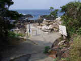 平内海中温泉。波打ち際にあるので、干潮の間だけ入浴できる天然温泉。脱衣場等の施設もなく、水着不可なので、女性にはちょっと厳しい。この日は男性が2人入っていたので、あまり近づいて撮影できなかった。