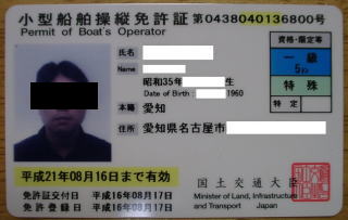 旧制度で4級を取得したので、特殊免許(水上オートバイ)と特定免許(旅客輸送)も付いている。