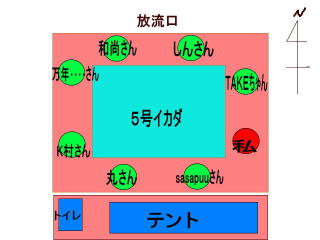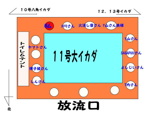 | 三重釣り歩き会の忘年会が、傳八屋で開かれることになり、ずいぶん前からお誘いを受けて参加することになっていた。 今回は、一緒に行く人がなく、自分一人で行くこととなった。そこで、前日夜に出発し、傳八屋の駐車場で車中泊することにした。 季節によっては、車中泊も気楽なものなのかもしれないが、ちょうど寒気がやってきており、雪の懸念もあるということで、寝袋+毛布を積み込んで、防寒対策を万全にした仮眠対策から準備は始まった。 出発の日は、いつものように仕事を終え18:00頃には帰宅したが、家族は私の都合など全く関知せず・・・という状況なので、あれこれあって、出発は22:30になってしまった。 金曜の夜なので、高速1,000円は使えないので、ひたすら23号で行くことに。 いつもの玉城のエサ屋&コンビニで必要量を買い込み、傳八屋に着いたのは1:30頃であった。既に到着して同様に仮眠中のsasapuuさんの車の隣に停めて、トイレを済ませた後狭い車中で寝袋+毛布にくるまり寝ることに・・・ 5:30頃に目覚めて、外を見ると駐車場に皆さん到着されていた。 TAKEちゃんに声をかけていただいたのをきっかけに、寝袋から出て皆さんと挨拶をし、受付を済ませ、TAKEちゃんが買っておいてくださったシラサエビを受け取る。 なかなかの大きさに、期待感をこめて、準備を始める。 今日は、「おうみ楽釣会」の方も一緒で、総勢40余名、10号〜13号の離れ島をすべて貸し切っての忘年会だった。 そして、私の釣り座は、朝のクジで11号大イカダの南東角だった。 記憶をたどると、次のような感じだったと思う。(お名前を存じ上げない方、無名ですみません。) ![]() 大イカダは、14〜15名だったので、角に入れただけでもラッキーだと思った。しかし、この角が全くハズレで、朝から終了まで、小物1匹も上がらず、アタリすらなかった。 朝一、急に冷え込んだせいか、誰もあたらない・・・しばらくして釣り上げたのはよしじいさんのタイが最初だったような・・・ 一方私は、開始前に入念に底を測ったのに、朝一から根掛かり(>_<) 嫌な予感・・・ その後、ポツポツと釣れ始めるが、釣れるのは、T内さん、よしじいさん、sasapuuさん、Y山さん、火消し屋さん辺りまで・・・H川さんから私を挟んで、しんさんくらいまでは、音沙汰ない状態だった。 その後、火消し屋さんは、シラサでヒラマサを連チャンするなど、終盤のシマアジ連チャンまで、終始活性があったような〜。また、タイも西側の方ばかり・・・さすが〜。 私の前は、ピクリともせず、両隣のH川さんもヤマトさんお二人連れも同様であった。 最初に、東側で掛けたのは博子姫さん(よしじい奥様)が、クロソイだったような。その後、ブリを掛け、よしじいさんが途中から交代して見事ゲットされていた。 まあ、周囲はそんな感じであったが、私は全く蚊帳の外・・・(-_-;)、真ん中へ投げても、西側のポイントには届かないらしくピクリともせず・・・ イカダ竿に持ち替えて、足下を探るが、どの棚を探っても穂先は微動だにしない・・・ 完全お手上げ状態で、2回の放流をそれなりに期待して迎えたが、2回とも全く自分には無意味だった・・・(>_<) タイを始め小物は、全く足下にいない・・・ 朝方は、風もまだ穏やかだったが、次第に強く吹くようになり、頭をよぎるのは釣り堀初のボ〜ズ! 寒風の中、全く生命反応も感じられず、釣れる気もしない・・・いったい自分は何のために今日来たのか・・・なんて考えてばかりで、気持ちは焦ってどんどん奈落の底へ・・・ まるでデフレスパイラルのような、悪循環・・・そこから抜け出せない 釣れない→焦りから冷静さを欠く→余計に釣れない→更に焦る・・・ 時計を見ると11時。残り、3時間だが、釣れる気がしない。 でも、なんとかしなければ・・・そこで、悪循環をリセットして考えた。 足下にいないのなら、青物狙いに徹するしかない・・・ハズレたらボ〜ズ。 そう決めて、6号オモリしかないので、大きめのアジのヒレを切り、穂先の少し先へゆっくり落としていく・・・ しばらくは何事もなく、アジの動きが時折、オレンジのサビキウキに出る程度だった。 何分たったか覚えてないが、ウキがす〜うっと沈んで行く!釣り始めて4時間、その空白を破る待望のアタリ!! 充分沈み込むのを待ち、アワセて重量感が感じられた瞬間に青物コール。絶対にバラしたくはなかったので、ややゆっくりめにやらせてもらい、カンパチが上がってきた。 火消し屋さんに上手にすくっていただき、やっと1匹〜!(^^)! なんとかボ〜ズは逃れた(^o^) でもその後は、また暇な時間の連続・・・ いつもは、このくらいの時間で、小物を追加するのだが、何回探っても足下にはいない・・・(-_-;) で、仕方なく青物狙いでひたすらアジ、イワシ、キビナゴ、シラサ等々をローテイションしながら、アタリを待つ。 無駄な時間がどんどんと流れていき・・・ やっと、次のアタリがあったのは13:40頃。 今度も慎重に上げてき