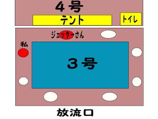 | ジェッターさんにお願いし、私の休みが取れる日に一緒に釣行をお願いした。 当初は、北陸方面へイカを夜釣りで狙いに行く予定だったが、夜半から明け方のの天気予報が芳しくない・・・相談の結果、夜明けからは雨の上がる三重方面の釣り堀に急遽変更することになった。 どこへ行くか迷ったが、結局は行き慣れた傳八屋に行くことに。 午前3時にジェッターさん家に迎えに行くべく、目覚ましを2:30にセットして23時過ぎにウトウトし始める・・・ しばらくして、枕元に置いた携帯が鳴っている!あれ?何かトラブルかな??? しかし、それはジェッターさんからの「モーニングコール」だった(^^;) なんと、時計が故障して時間は3:10・・・(あらら・・・大汗) すぐに着替えて、なんとか20分後くらいにジェッターさん宅へ到着。 なんとか、傳八には6:20頃にはたどり着いた。 今日は、平日でもあり、客は全部で25名ほど。使用イカダは、1号、3号、4号、5号だった。 1号は、毎週水曜日の常連さんだとかで、3人で貸しきりだった。 で、我々は3号イカダに8人での乗り合いだった。(1人客2人。2人グループが我々を入れて3グループだった。) 場所は、以下のように陣取った。 ![]() 昨日の、釣果も良かったとかで、期待しながら第1投〜。 最近は、朝一はキビナゴと決めているが、すぐに反応があり、タイがかかるが、上げてくる途中で、ジェッターさんの仕掛けに絡んでしまいバラシ・・・ ありゃりゃ・・・でも、めげずにすぐにキビナゴを再投入。今度はオマツリしないように右側の人に近い方に仕掛けを入れる。 すると・・・また反応が・・・あわせると結構ないい引き!タイか?いや青物?でも走らない??? ほどなく、黒ずんだ魚体があがってきた。ハタマス! 実は、私はこの魚を釣るのは初めてである(^o^) 右隣の人にすくってもらって、無事にキャッチ!「これだけでも、元は取れるよ〜」ってお隣の方から言われて、気分はサイコー! スカリに入れて、またキビナゴを落としていくと、程なくアタリ!今度は横へ走るので青物を確信。即青物コール。 しばらくやりとりすると、カンパチが見えてくる。よく朝一でドラグが調整不足で、魚の突っ込みをかわしきれず、ハリス切れ〜(/_;)ってパターンが多いので、今日はちゃんとしないと〜! でも、ドラグを調整しようとリールを触っている時に、魚が走り・・・手が絡まり・・・プッツ〜ン(^^)/~~~やってもうた〜(涙) う〜ん、いつものパターンの繰り返しである(-_-;) これで、アタリがなくなってしまったが、ふと目の前に誰かが捨てた瀕死のエサアジが。 タモですくって、ハリにかける。ほとんど泳ぐ力もなさそうなので、すぐ目の前に入れた・・・これが吉とでて、馴染むとすぐにアタリ! また、重い〜!でも、青物とは違う!? 半信半疑で巻いてくると黒っぽい魚体が〜(^_^)v なんと2匹目のドジョウ〜いやハタマスである。 これで、もう早上がりしてもいいかな〜なんて思いながらも、せっかくきたのだからと釣り続けるのが、釣り師の悲しい性(^^;) しかし、その後は1回目の放流まで音沙汰がなくなってしまった。 イカダ全体では、ポツポツと上がっていたような・・・ 1回目の放流後、期待をするが変化なし。しばらくして、やっとアタリを拾ってタイを1匹釣る。でも後が続かない・・・ その間も、対面の人や放流口の方の人は、青物をかけたりしている。 でも、ここまでに心の余裕ができているので、今日は焦らずのんびりと・・・まあ、いいさ・・・とのんびりモード。 2.1mのイカダ竿に替えて、コーナーを攻めるも、反応が無く、潮の流れが変わるまではダメらしいと諦める。 そうこうしながら、無駄に時間が過ぎていくうちに、2回目の放流。 ここぞ!とアジを投入するが、他の人が先にかけて、すぐに巻き上げ待機状態・・・ しばらくは、見ているだけで時間が過ぎていった〜〜〜。で、ようやく一段落した頃にアジを投入。 すると、小アタリの後、ウキが沈んで行く〜。ドキドキしながら十分持って行かせてから青物コール。 結構な重量感で、なかなか上がって来なかったが、良型のカンパチが見えるようになってきた。 魚の顔も見え、ここまでくれば〜とほんのちょっと気を許していると、タモを構えて待っていたくれたジェッターさんの前辺りのスカリに絡まりかかり、引き離そうと引いたら・・・ プッツ〜ン〜 またやってもうた〜(涙) いつもハリスは5号なのだが、過去には同じ仕掛けで10kg超えのブリもOKだったので、ちょっと油断していたのかもしれない。 とにかく、ありゃりゃ〜〜〜である。ハリスがクッションゴムのサルカンの結び目から切れていた。 青バラシ2本目。いつもなら、最悪であるが、今日はハタマスが(^^;) イカダ竿に持ち替え、冷ウタセのむき身にして、落としていくと6m〜7mでアタリが! 心地よい引きに、上がってきたのは美味しそうなイサキだった(^_^)v これは行けるかも〜。とすかさず次を投入すると、イサキを追加〜。更にタイを追加〜。 さあ、