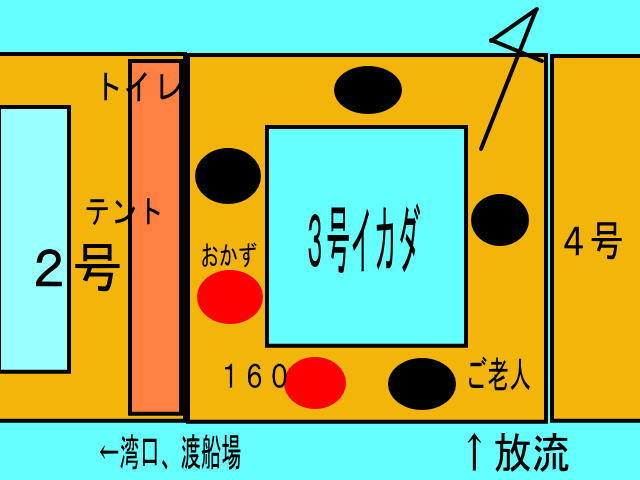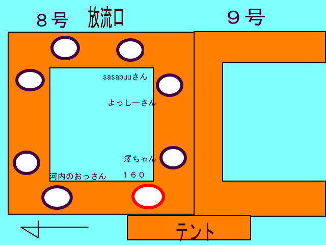 | 好人さんの呼びかけで、毎月行われている「三重釣り歩き会」。10月の例会は、3連休の真ん中の日曜日。募集の告知がされたのは、夏の頃だったか・・・参加をすぐに表明したが、ほんの数日で満員になったようである。 最近は、この「三重釣り歩き会」のチケットも、なかなか取れない人気ぶりである。まあ、10月という絶好のシーズンでもあるし(^_^) 当日は、河内のおっさんも参加ということで、往復乗せていってもらえることになった。河内のおっさんと行くのは10ヶ月ぶりだが、楽ちん釣行で感謝、感謝である。 2:30に自宅へ迎えにきてもらい、高速に乗って、玉城のエサ屋に着いたのはまだ4時台だったか。3連休で天気予報もまずまずで、とっても賑わっていた。車が駐車場に入りきらずに道にもあふれていたが、釣り堀目的の人以外にも、チヌ筏の人もたくさんいた。 辨屋の駐車場に着いたのは5時前だった。まだ、真っ暗で、「なんでこんな時間に集合なの?(-_-;)」と思ったが、どうも辨屋は受付順に筏に渡してもらえるそうで、そのために早めに集合時間が設定されたようだ。 そのおかげか、6時半頃には筏に渡してもらえた。 ![]() 今日の使用筏は8号、9号で、くじ引きの結果、私と河内のおっさんは、8号筏の以下の位置になった。 ![]() BBQの用具やら、それぞれの荷物やら、積み下ろしと準備とで、好人さんの発声でスタートしたのは7:20頃だった。 朝一のアタリは北側だけで、他は河内のおっさんがタイを1匹釣っただけであった。私は全く魚に見放され、1回目の放流まで、全くアタリがなかった。 1回目の放流後、置き竿にしてキビナゴを付けておいた竿が反応し、巻き上げるとタイが釣れた。棚は7mであった。今日は風が強いせいか、底網が安定せず、棚オモリで測って9m+αくらいあるのに、ウキ止めを8mにしていても根掛かり多発・・・(-_-;) そこで、少し巻き上げて7mにしていたものであった。 次を狙って、同様にしているとまた穂先が反応した。今度は食い込ませるために糸をゆるめ、ウキでアタリを取って2匹目のタイを釣った。 その頃だったか、右隣の澤ちゃんが急用ができたというので、急いで帰って行った。 でもそこまでで、アタリが遠のいたので、筏竿でコーナーを探る。潮が手前に流れているせいか、すぐに横網に根掛かり・・・。 オモリを追加して、早めに沈めるようにする。5〜6mでは何の反応もなかったが、7mでコツコツとアタリ(^_^)v 食い込むのを待って合わせると魚の反応。タイが釣れた。 その後は、置き竿で1匹、またイカダ竿で1匹という具合で、2〜3匹追加した。 10時頃、2回目の放流船がやってきた。放流直前から一応、活きアジを付けて放り込んでみるが反応はない。 放流が終わって、一番に青物コールがあったのは対面のsasapuuさんだった。タモ入れ後、すぐに自分の仕掛けを放り込むが、また誰かが青物コール。なかなか仕掛けが入れられない。 でも、その直後にアジを放り込むとウキが沈み込んだ!隣の河内のおっさんも同時に青物コールで、お祭り???と思ったが、しばらくすると別々の方向に走っていくので、別の魚だと分かりやりとりを開始。 それほど走られもせず、間もなくワラサが見えてきた。よっしーさんに掬ってもらって、無事ゲットした。 まだ、青物の活性はあると思い、また活きアジを放り込む。するとすぐにウキが沈み込む。が・・・合わせると軽い(>_<) そんなことを2回も繰り返した。どうも、シオが食いついていたようで、アジを飲み込めずくわえていただけのようであった。 で、間もなく青物フィーバーは終わってしまい、静かになってしまった。放流された数匹が食っただけで、終了であった。その後は、終了まで状況は変わらず、在庫がないか、あっても活性はなかった。 その点、お隣の9号は、まずまず活性があったようだった。 昼前に、9号のコーナーでイサキが釣れると言って、sasapuuさんが出稼ぎで4〜5匹釣ったというので、私もお邪魔する。 死にボケを1mちょっとに落とすと、すぐにアタリ。イサキが釣れるが、タモを持ってこなかったので抜き上げようと思ったら・・・水から出ると同時にポチャンと落ちてしまった。(;_;) やはり、どんな場合でもタモは必須だなあと、反省すること頻りであった・・・ その後は、自分の位置に戻る。 好人さんがBBQの準備をして、もう食べられるというので、少し食べ物をいただく。毎回、私は釣りに熱中していて、お手伝いもせず申し訳ないと思う。皆さんのために、いろいろと準備をしてくれる好人さんに感謝、感謝である。 13時を過ぎ、残り時間も1時間ほどになった頃、イカダ竿でコーナーを探るとアタリが(^^) また、横網に引っ掛かったり、網の外の魚のアタリを拾ったりと、トラブルも結構多発したが、青イソメのエサでなんとか数匹を追加した。 でも、ハリ外れや、ハリス切れ等もあったので、実際のアタリは結構あり、楽しい時間だった。 終盤、せっかくカニを買ってきたのでと思い、落としてみ
