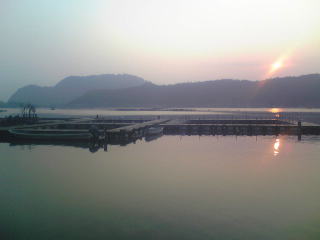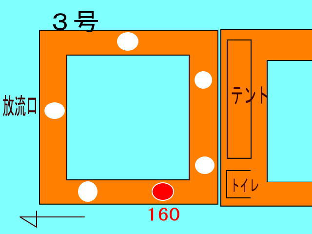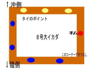 | 今回の釣行は、ずいぶん前にTAKEさんから誘っていただいて、予定を入れていた釣行である。直前にならないと、最終決定はできないのが私の仕事の困った点で・・・でも、なんとか行くことができたので、よかった。 福井のレインボーは初めての釣行なのだが、ちょっと特別な縁のある釣り堀なのである。 それは、レインボーのHPのリンク集に、私のこのHPがリンクされているからだ。何故そうなっているのかというと、以前、ヒロヤン(現レインボー代表)がまだ大学生だった頃、私のHPの掲示板で彼とはいろいろと話していたことがあるのだ。 その縁で、レインボーのHPのリンク集に私のHPがリンクされている。 残念ながら、実際にレインボーへ行く機会はなかなかなく、今回行くのが初であったが、何故か初めてとは思えなかったのは、上記のような事情があったからである。 さて、当日は午前2時半にTAKEさんに、自宅へ迎えに来ていただいた。往復TAKEさんの運転で、楽ちん釣行であった。感謝、感謝である。 高速を使って、敦賀までは約2時間。道路事情が良いので、とっても早い。 敦賀を出た後、少し一般道を逆方向に走ってエサ屋に寄った。三重とは違い、あまり混み合ってはいなかったが、やたらと注意事項が細かく書いてあった。横着な客が多いのだろうか、それとも店主が過剰なのか・・・ 活きアジは三重から持ってきているそうで、その影響で海水代を取られたり、単価も高かったりする。また、自分でアジバケツを持って行かないと、ビニール袋に入れてはくれない。 まだまだ福井では、釣り堀はメジャーにはなっていないようである。 今回は、冷凍エサは一通り持って行っていたので、活きアジを現地(レインボー)で買おうと思っていた。 基本的にレインボーでは、活きアジの有無は当日の朝にならないと分からないということになっている。しかし、平日なら大丈夫だろうと思っていたのだが・・・今日は入荷がないということだった。 こういうことがあるから、やはり活きアジは途中で買わなければいけないのだと思った。多少高くても・・・ ![]() レインボーの駐車場には、夜明け前に着いた。周囲は明るくなっており、既にたくさんのお客さんが来ていた。 本日ご一緒する、K村さん、よっしーさん、Sさんは、まだ着いていなかったが、TAKEさんへの連絡では、道に迷ってしまわれたようであった。なんとか、開始時間までには到着したが、「三方五湖の五湖巡りをした。」そうで、釣りをする前からお疲れのようであった。 本日のイカダは5号だそうで、くじ引きの結果、次のような場所で釣り始めた。 ![]() 朝一期待して8mに黄甘エビを沈めるが反応はない。皆さん、同様に反応がなく、昨日が休みだったということを思わせる雰囲気はなかった。 そのまま、しばらく時間が過ぎるが変化はなく、棚を上げたり下げたりしたが同様だった。しかたなく、エサをキビナゴに換え、また底に落としたときに、初めてウキにアタリがあった。でもなかなか沈み込まず、反応がなくなってしまった。 で、巻き上げてエサを付け換えもう一度待つと、今度はウキが沈んで行ったのであわせたが、エサだけとられて素バリを引いてしまった。 再度、キビナゴで様子を見ると、またウキにほんの少し反応があったが、しばらくするとなくなったので、巻き上げる。すると途中から重くなった。 テンションをかけると走り始めたので、青物コールをして巻き始める。結構元気で、なかなか上がってこなかったが、しばらくしてカンパチが上がってきた。 朝一からカンパチとは、縁起がいい。その後の展開がとっても楽になった気がした。 その後、K村さんが青物を掛け、その活性で青物が浮いてきた。皆さん青物を狙われ、私もすかさず、キビナゴを付けて誘う。すると、ワラサが食った。やったーと思いながら巻き始めると、何か違和感が・・・ よく見ると、さぐり竿の穂先が変な形に曲がっている。ラインが絡んでしまったらしい。仕方なく、手元に穂先を寄せて、ラインの絡みを直した後、やりとりしたが、途中でハリ外れしてしまった。残念・・・だが、もっと残念なことに、穂先が折れてしまっていた。 イレギュラーにエサを引いて、食わせるのはいいのだが、外ガイドだとこの時に穂先に絡んでしまうのが難点である。次回からは、インナーガイドにしようと思った。 その頃、1回目の放流が始まった。イカダ竿に持ち替えて、コーナーを狙うことにした。 しばらく経った頃から、コツコツとアタリが出始めて、タイが釣れた。その後もポツポツと、タイが釣れた。表層4mくらいの時もあれば、底まで落とした時もあった。 エサも、イシゴカイ、死にボケ、甘エビ、黄ササミ等々いろいろだった。アタリは頻繁にあり、バラシもたくさんあったが、タイ5匹、サンバソウ2匹をゲットした。 あるときには、自分の仕掛けとSさんの仕掛けが絡んだようなので、二人でゆっくり上げてみた。魚は私の仕掛けに付いて