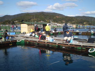 | 息子の受験のために、釣りへ行かなくなってから2年。 この先、いつまでこのままか?と思っていたが、去年の秋に、なんとか進路も決まり、釣りに行けることになった。 最初は、息子と二人で行こうと思い、昨年の12月に予定を組んだ。しかし、とっても残念なことに私が風邪をひいてしまい。復活釣行は持ち越しとなってしまった。 そのころ、好人さんが掲示板で「三重釣り歩き会」の新年会の参加者募集されていることを知り、参加をさせていただくことになった。 以前から、ご近所でいつも同行いただいていた、河内のおっさんも行かれるということで、当日は乗せていっていだだけることになった。 さて、当日は5:30に傳八屋の休憩所集合と言うことで、3時に河内のおっさんに迎えに来ていただく。 この2年の間に、新たな高速ができ(名二環)、とっても便利になった。その名二環を使って、湾岸〜東名阪経由で、玉城まであっという間に着いた。 旭屋でエサを仕入れようと、立ち寄るとJackyさん、さちさんと一緒になり、ご無沙汰のご挨拶をした。 その後、サークルKで食べ物を買おうと立ち寄ると、イケチャン親子にもお会いし、ご挨拶をする。イケチャン親子は、今日は辨屋だそうである。 傳八屋の駐車場に指定時間の、ちょい早めに着いたが、もうすでにたくさんの車が停まっていた。 とりあえず、事務所に寄り、年末に振り込んだ金額分の特選券を受け取り、それから休憩所に行く。 この2年間に、三重釣り歩き会の参加者も入れ変わり、知らない方々がたくさん。 好人さんの司会で、全員の紹介があったが、すぐには覚えられず・・・(汗)まあ、徐々に覚えていこうと思う。 その後、釣り座のくじがあり、私は9号小イカダの東側の南角になった。 この時期は、西側、北側など太陽光を受ける側がいいようで、場所としては厳しいようだが、久しぶりだから釣れるだけでもうれしかった。 さちさんがイカダの上で豚汁を作るとか、牡蠣やら何やら焼くとかで、めいっぱいの荷物を、皆で一緒に運んで、7時過ぎにイカダに渡してもらう。 風もない晴天で、真冬の釣りにしては、コンディションはまずまず。 ![]() あれこれ共同の荷物の整理やら、個人の準備やらで皆忙しく動き回り、ほぼ皆さんの体勢が整ったところで、好人さんからスタートの合図があった。 私は、ササミを付けて、底一杯に下ろしてみる。が、反応がない。イカダ全体も静かなもので、並み居る名手がお揃いなのに、誰も釣られない。 魚も、尋常ではない殺気を感じていたのだろうか(笑) かなり、時間が経過した頃、目の前の河内のおっさん(角を挟んで左側、南の辺の西側)のウキに反応が。沈み込んだところをあわせて、タイをゲットされた。 エサは甘エビだそうで、私も付け替えて、同じ辺りへ放り込む。しかし・・・反応はない。 ずいぶんと待ったが、反応はなく、「あれ?釣り堀ってこんな感じだったっけ?」と自問自答。以前なら、この辺りで1匹くらいは釣れていたように思うのだが・・・ 冬場だし、活性がないからしかたないのか・・・? そうしているうちにも、河内のおっさんは順調にアタリを拾い、2匹のタイを追加されていた。 一方、私のウキはピクリとも反応しない。せめて、何らかの生命反応があれば楽しいのだが、全くない。 そこで、ハリスを3.5号に落とし、シラサに付け替えてみた。 すると、仕掛けが馴染んでしばらくした頃に、待望のアタリ!沈み込むのを合わせると、久〜〜〜しぶりの魚の手応えが。 タイかな?と思ったらツバスで、久しぶりのやりとりにあちこち走られて、皆さんにご迷惑をおかけしたが、河内のおっさんに上手にすくっていただいた。 やった〜!これで、ボースは逃れた〜(笑) 以前なら、「な〜んだ、ツバスか・・・」と思っていたが、今日はこのツバスがとっても嬉しかった。 連続を狙うが、追加はなく1回目の放流を迎える。 タイを中心に、小物が放り込まれる。しばらくして、対面の人や北側の人はポツポツとタイを釣り始める。しかし、私は相変わらず流れに乗れないままでいた。 かなりたった頃、ササミが半分ほど食われていたので、すかさず新しいササミに替えて送り込むと、素直に反応が出て塩焼きサイズの小型のタイが釣れた。 そこで、またストップしてしまった。 発想を変えようと、朝から気になっていた群泳するグレをよく見てみた。食い気はなさそうだが、よ〜く見るとシマアジが混ざっている。 そこで、シラサを付けて泳いでいる棚(2〜3m程度)に落としていく。群れが、私のエサの方へ来たときに、群れの中から1匹が、シラサに食いつくのが見えた。瞬間、合わせると魚がかかり、またまた走られたが、河内のおっさんにすくっていただき、良型のシマアジが釣れた。 ワクワクドキドキ楽しい、見釣りの始まりである。 すぐに、次を狙うべく、今度はミックに替えて群れの棚付近に落とす。すると、またシマアジがパクリ!しかし、ほんの一瞬あわせが遅れてしまい、