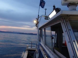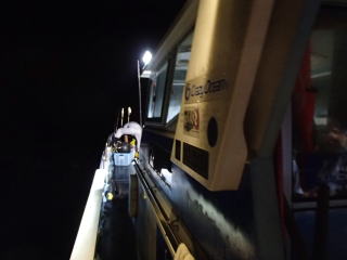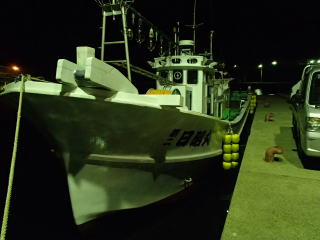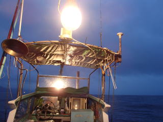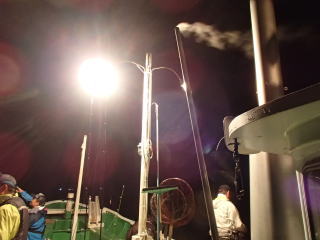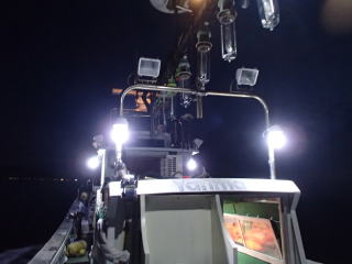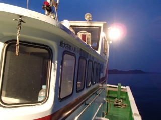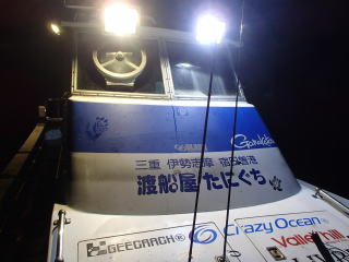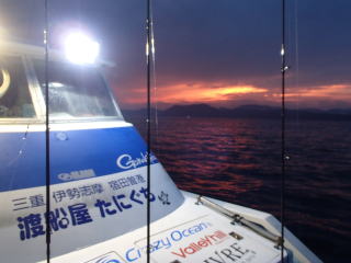 | 前回(6/14)イカメタルに行って味を占め、次回は好人さんも加わり、すぎーKさんと私と3人で並んで釣るという計画が持ち上がった。そして、6月28日(土)にその計画を実行する予定だった。 しかし、当日は雨模様で波も高く、船が出船できなかった。ということで、残念ながら3人並んでのイカメタルは実現しなかった。で、次週の予約を入れようと思ったら、すぎーKさんからの情報で、ご自身は予約が取れたが、太幸丸はもう満船とのこと。そこで、同じ錦の愛海丸に連絡を入れた。 すると、アジングの予約で一杯だが、イカ釣りで人数が集まったらもう1船出すので、出船できるようになったら連絡するとの回答だった。週明けまで待っていたら7月1日(火)に、愛海丸の船長から電話があり、出船OKということで5日(土)に錦に行くことになった。 当日は、また雨の予報で、おまけに波も高そう・・・、2週連続で休船かと思ったが、なんとか波は治まって、予定通り行けることになった。 出発したときには曇りだったが、三重の南部になると雨がだんだん強く降ってきた。17時30分過ぎに錦に到着すると、すぎーKさんは既に来ていて、雨がそこそこ降る中、挨拶をし話をする。先に太幸丸が接岸したので、すぎーKさんを見送った後、自分は、愛海丸の頼んだという船に乗る。船はやや小さめで、定員は5名だったか・・・でも客は私と3人グループの計4人であった。3人グループに前に入ってもらって、私は船尾に釣り座を構えた。 港を出ていくとやや波が高くなり、船が小さいせいもあるが前回、前々回よりは明らかに揺れが大きかった。20分ほどでポイントに付き、アンカーが入ったが、船縁が低いので立って釣るにはちょい釣りづらかった。そこそこ揺れるのだが、もたれるものもなく踏ん張っているのは少し大変だった。 ![]() 釣り始めると、後方に向かう流れがあって結構仕掛けが流された。最初にオモリを付けて水深を測ったが75mくらいあった。 鉛スッテを15号にして30m付近から、少しずつ下げたり、一気に底まで落として探ったりするが反応は皆無だった。その状態は、変わらずに時間だけが過ぎていき、7時過ぎに灯りが点いて状況が変わることを期待したが、何も変わらなかった。 ←移動中20時を過ぎても、誰も釣れないので場所移動することになった。錦の地図はよく分からないし、暗いので全くどっちへ進んでいるのか?って感じだったが、船長いわく東に移動したらしい。確かに、左手にうっすらと陸が見えていた。30分近くかかって移動し、次はそこで釣り始めた。 移動途中にすぎーKさんに、「今日はダメです。」とメールを送ったが、すぎーKさんからも、厳しいとのメールが返ってきた。どうも、今日はハズレの日だったらしい。 今度は、最初のポイントほどには流れがなっかたが、オモリで水深を測ると80mを超えていた。船長からは30m付近という指示があったので、そこから40mまでを丹念に探るが、ここでも反応はない。30分以上した頃、前方の1人が1パイ釣り上げた。 それからしばらくした頃、40mからゆっくり巻き上げていたら30mの手前で待望のアタリ!で、ムギイカが釣れた。今日はボ〜ズかと思っていたが、なんとか最初の1パイが釣れた。で、用意してきたタッパーの沖漬けのタレの入った容器に入れた。クーラーで冷やしていたせいもあるのか、イカはあまり暴れずにすぐに静かになった。 追加を、と同じ棚で狙うが反応はない。他の人も同様で、1パイ釣っても次が釣れる感じはなかった。これではボ〜ズ逃れがやっとで、数は伸びないな・・・と諦めモードで探る。 30分程も虚しい時間が過ぎた頃、35mくらいから一気にフォールさせたら40m付近で糸ふけがでた。あれっ?と思って合わせたらイカが乗っていて、やっと2ハイ目が釣れた。これも、沖漬けのタッパーに放り込む。 そして、また虚しい時間に戻る。とにかく、アタリが少なく手も足も出ない。途中でスッテを交換してみたが、何も変わらないので、とりあえず2ハイ乗ったスッテに戻す。 それからずいぶん経った頃、またフォールさせていたら乗って、3ハイ目が釣れた。この3ハイ目は良型のスルメだった。 その後は、23時の終了までに、もう1ハイ釣れただけだった。反応があっても乗らなかったのもあったが、ほんの2〜3回だった。とにかくイカの影が薄い・・・そんな感じだった。 帰港すると、愛海丸の船長からは「アジングの方は、浅場でアカイカがたくさん釣れた。」と教えてもらった。どうも、この2〜3週間の間に海の中は変化してしまったらしい。 次回は、浅場でアカイカ(ケンサキイカ)を狙うそうなので、それに期待したい。 まあ、慰めとしてはスルメの沖漬けが美味しかったことか。沖漬けは、次回もまたやってみたいと思った。 目次へ |