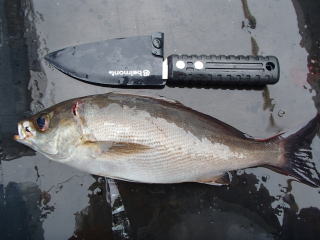 | 先々週に、今季初のティップランに大紀町錦へ行った。次の予定は決めていなかったが、23日の秋分の日にどこかへ行こうと思っていた。前々日に予報を見ると天候も良さそうなので、いつものたにぐちに行くことにした。 6時に集合ということで、いつものように前日出発、車中泊だった。3日前に福井へ釣りに行ったばかりなので、疲れがあってかいつもよりはよく眠れた。しかし、起きても疲れは残ったままだった。 今日の客は、私を含めて4人で、皆1人ばかりでグループはいなかった。釣り座は、なんとなく船に乗り込んで荷物を置いた順に決まってしまった。まあ、4人だからゆったりと釣れるからいいのだが、できれば一番前か一番後ろになりたかった。実際には、前から2番目の釣り座だった。 ![]() 6時に出船するが、イカダの客が遅刻してくるので、近場でひと流しし、その後一度港に戻ってイカダの客を乗せて、送っていくということだった。そこで、最初は湾内の浅場からスタートだった。期待しての第一投目、さすがにそれでは反応は無かったが、2〜3回目で反応があり、イカが乗った。ゆっくり上げてくるとコウイカだった。いつもなら、イカが掛かったのをみていて船長がタモを構えてくれているのだが、このときは電話対応に急がしかったのかキャビンにいた。で、寄せてきたが、「抜き上げればいいか」と思って抜き上げると、外れてしまった・・・船長からは「掛かったら、言ってくれなきゃ〜(笑)」と言われたが、朝一で頭が回っていなかったのもあって、普通に抜き上げようとしたのが失敗だった。まあ、コウイカは足が短くて外れやすいのは知っていたことなのだが・・・(^_^;) 朝一だったので、このときはまだ余裕で、「コウイカくらいまあいいか・・・」って感じだった。で、しまったとは思いながらも、気を取り直してしゃくると、2〜3回後にまた手応えが! (^_^)v 今度は、船長にしっかり掬ってもらい、小さいながらもこの秋初のアオリイカが釣れた。「な〜んだ、イカの魚影は濃いじゃん。」と思ったのだが、実はこの活性はこの時だけだった。 しばらくして、最後尾の人が1パイ釣った後、イカダの客が到着したので港へ戻った。そして、その客を湾奥のイカダに送って、もとの場所へ戻る。しかし、もう活性はなくなってしまったようで、誰にもアタリがなくなってしまった。 しばらくして、イカではないアタリがあり、しつこく狙ったら魚が掛かり、しかし水面で外れて逃げていった。アオハタの幼魚だった。 その後はイカも魚もエギに接触してこなくなった。あちこちポイントを変え、流しても誰も釣れなくなってしまった。当然、皆さんエギを変え、しゃくり方を変え、工夫をいろいろとするのだが、何も釣れなくなってしまった。 ポイントを田曽の大突堤のすぐ外側に移したとき、落としてしゃくろうとしたらPEが途中から切れてしまった。何度も使い回ししていたので、弱った部分から切れてしまったようだ。適度に、新しいラインに巻き替えないといけないと反省した。 その後、湾の外へ出て行って、あちこちで流してくれたが、反応はなかった。そんな低活性の日だったので、落としてしゃくるという一連の動作も虚しく、穂先に集中しても、なんら生命反応は感じられないまま時間だけが過ぎていった。 釣り方が悪いと言うより、イカがいないという感じだった。11時を過ぎた頃から、「お助けリグ」を試そうと、エギの50cm程上にスナップを結びつけ、ノーマルのエギを付けて釣り始めた。船はあまり流れていないし、客も少なくオマツリの危険もなさそうだし。また、根掛かりもそれほど頻繁ではなく、一度にエギを2個失う可能性は低そうだと思ったからである。 答えが出たのは12時頃だった。やっとアタリがあり、2ハイ目のアオリイカが釣れた。上に付けた2.5号のエギに掛かっていた。しかし、その後はまた元通り、無反応な時間になってしまった。 あまりに釣れないので、船長の判断で時間を延長してくれたが、結局何も変わらないまま14時に終了した。アオリイカは、私の2ハイと他の人の1ハイの計3ハイだけだった。その他はコウイカが1ハイ、アカイカが1ハイだった。 なので、「お助けリグ」という釣り方特有の誘いを試したのだが、それが正解なのか不正解なのか、全く分からないままだった。 次回はもうちょっと釣れるといいのだが・・・ ![]() 養殖マグロにエサを与えていた 目次へ |