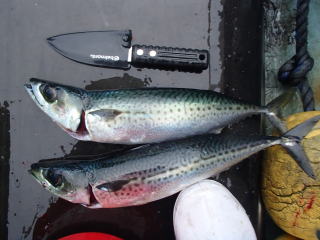 | いつもお世話になっている南伊勢の渡船屋たにぐちが、イカメタルを始めたというので行こうと思っていたのだが、なかなか機会がなく、やっと行ける日ができたので予約した。 15時出船ということで、当日の朝ちょっと用事があったが、それを済ませてから出発した。途中やや渋滞があったが、14時過ぎには田曽に到着した。 一昨日から昨日の深夜にかけて台風が通過し、うねりがまだ残っていて、また雨の影響で水は濁っていた。 14時半過ぎには船長も到着し、客も揃ったので15時少し前には出港した。今日の客は2人ペアが二組と私の5人だった。それにT.T.F.C(Tosenya.Taniguchi.Fising.Club)のK君も一緒だったので合計は6人だった。釣り座は、2人ペア二組が前で、私とK君が後ろだった。 港を出て行くと台風後のうねりがまだかなり残っていて、船は上下結構によく揺れた。 ![]() 20分〜30分ほど走ったところで、まずは浅場でのアカイカねらい。大潮なので、流れが速く軽いスッテでは流されてしまう。そのせいもあったのか、そもそもイカがいなかったのか反応はなかった。 そこで、すぐに移動してジグでの釣りになった。 ジグで釣るのは初めてなのだが、潮がやや速いので40g〜50gだとかなり流されてしまう。でも、それより重いジグを持っていなかったのでそれでチャレンジした。最初は要領がよくつかめなかったが、とりあえず底まで落としてからちょい竿を上げてフォールさせ、ちょっと巻いてまた同じことを繰り返した。 すると、穂先に小さなアタリがあり、合わせて巻き上げると小サバが引っかかってきた。リリースしてまた同じことを繰り返すと、今度は根掛かりか?と思う感じがしたが、穂先で聞くと魚の反応が、あまり暴れないがちょい重いな〜と巻き上げてみると、良型のカサゴが釣れた。 船の前の方では良型のイサキが釣れたというので、ジグをオーシャンフラッシュ50gに交換して狙ってみる。イサキは掛からなかったが、大型のサバが掛かり、かなりの手応えで楽しませてくれた。釣れたサバは、船長が首を折って血抜きをしてからクーラーに入れてくれるので、楽ちんで、また帰ってから美味しく食べることができた。 その後もぽつぽつとアタリがあり、強烈な引きで大サバが追加できた。そのうちの1回は、あまりによく引き、また重いので、いったい何が??と思ったが、大サバがダブルで掛かっていた。しかもそのうちの1匹は、前の人がバラしたジグをくわえていた(^o^) サバ以外は、底付近で待望のアカハタが釣れた。これは、刺身で食べたが最高に美味しかった(^_^)v また、1回だけだがそこそこのイサキが掛かったのだが、水面付近まで寄せたときに、波で揺れてよろけた瞬間にバラしてしまった(-_-;) まあ、そんなこんなでリリースの小物(ムツ、カサゴ、小サバ、オコゼ)を含めて頻繁にアタリがあり、とても楽しい時間を過ごすことができた。 夕方になったころ、そろそろジグの時間も終了との合図があり、早巻きでジグを回収していたら途中で何かが食った。たぶん大サバだと思うのだが、なかなか上がってこず、残念なことにPEが高切れしてジグごと持って行かれてしまった(T_T) 去年のティップラン以来使い回しているラインだったので、擦れて弱くなっていたようである。次回は、ちゃんと新しいラインを巻いていこうと思った。 私のクーラー 皆さんの釣果その後、日が落ちる頃にアカイカ(ケンサキイカ)のポイントへ移動して、船の灯りが点けられた。パラシュートアンカーが投入され、釣り開始となった。流れが速いので、12号の鉛スッテを使用との指示があり、その通りに狙ってみる。しばらくして、横のK君が1パイ釣ったが、それっきりだったので、ポイントを移動する。 ![]() 今度は20m付近にベイトの反応ありというので、そこまで落とすとイカではなく魚っぽいアタリがあったが、乗らずに引っ張られてK君の仕掛けとオマツリしてしまった。その後は、小魚のアタリもなくなりしばらく静かだったが、仕掛けを落とすときに途中で止まった。あれ?と思いながら巻くのだが、手応えがあまり感じられず・・・でも水面まで巻いてくるとアカイカが乗っていた(^^) その後、15m付近で1パイ、20m付近で1パイを追加した。 で、水面をよく見るとアカイカが5〜6パイ泳いでいるのが見えた。仕掛けを巻き上げ、見釣りで狙ってみる。最初はイカが驚いて墨を吐いて逃げていったが、次に寄ってきたイカをなんとかキャッチできた。 すぐにイカは沈んでしまったが、10分後くらいにまた浮いてきたので、再び見釣りで1パイ追加した。 しかし、雲で隠れていた満月がやがて顔を出し、月の光が海面に射すようになると浮いてくることもなくなった。10m〜50mまで、5m刻みで探ってみたがアタリはないまま22時頃に終了した。 イカがあまり釣れなかったのは残念であったが、ジグでの魚釣りとのセットだったでとても楽しい時間を過ごすことができた。また、天然魚を食べるのは久しぶりなのだが、とっても美味