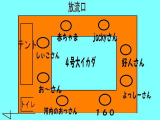 | 三重釣り歩き会の新年会について、告知されたのは昨年の11月頃だったろうか。場所は辨屋と言うことで、前回散々だったのでどうしようか迷ったが、皆さんとお会いできる機会でもあるので参加を申し込んだ。 当日は、河内のおっさんにいつものように同行願うことになり、いつも乗せて行っていていただくので、今回は私が車を出すことになった。 3時に迎えに行くことにしたのだが、早めに眠ることができないし、寝なければと思うと余計に眠れない・・・で、結局眠れないまま出発する。 5時10分頃に到着すると、既に皆さん集合のようで、新年の挨拶をする。今日の参加は24名、3イカダ貸し切りの大所帯である。 急な冷え込み、また正月休みから間もないこともあり、他の客は少なかった。そういう状況も手伝ってか、好人さんの交渉のおかげで大イカダ3イカダ貸し切りということになった。8人で大イカダなので、ゆったりと釣ることができた。 ![]() くじ引きの結果、釣り座は以下のようになった。 ![]() まだ、暗いうちにイカダへ渡してもらう。準備をするのにライトが必要だったが、徐々に明るくなり、スタートは7時くらいだったが、仕掛けやウキの視認に困ることはなかった。 ![]() 朝一、右隣のよっしーさんが、カンパチ、ハタを連チャン。活性はいいのかと気合いを入れるが、私には全く反応なし・・・(-_-;) イカダ全体ではポツポツと釣れ始めたが、私は蚊帳の外。好人さんのハタ3連チャンから始まって、jackyさん、赤ちゃままでハタが釣れていくが、やっぱり私には釣れない。 1回目の放流後、期待を込めるがやはり状況は変わらずだった。かなり経って諦めかけた頃、ウキが一気に入って、ツバスが釣れた。しかし、それも単発で後続はなしだった。 タイは陽の当たるテント前にいるようで、しぃこさんから河内のおっさんまでは、ポツリポツリと上げていく。私の前やら右のコーナーには生命反応は皆無だった。そんな状況なので、早々とよっしーさんはテント前へ移動し、タイを何枚か釣っていた。 状況は好転しなかったが、真ん中底で1匹、右コーナーの6mくらいで1匹タイが釣れた。しかし、釣れたのはそこまででストップ。 10時頃に青物の放流があって、期待を込めるがイカダ全体は静かなまま。青物狙いを皆さんがやめようかという頃に、しぃこさんがワラサを掛けて釣った。それから、ずいぶんと経過した頃に赤ちゃまがブリを釣り上げた。結局、終了間際に河内のおっさんがワラサを上げたぐらいで、放流量も少なかったが、釣れたのもこの3匹だけだった。 昼前くらいに、「160さん!竿が!」と好人さんに言われ、一瞬柵に立てかけてある竿?と思ったが、そうではなく右のコーナーに置き竿にしていたイカダ竿のことだった。朝から、全く魚のいないコーナーだったので、意識のなかからこの竿のことは消えていたのだが、視認できた頃にはすでに水没状態・・・(>_<) 慌ててタモでリールを引っかけようとするが届かず・・・ありゃりゃ、魚は釣れないし竿とリールまで失うとは・・・最悪(-_-;) もうどうすることもできないが、せめて底をさぐったら引っ掛からないかと、他の竿に大きめの針を結んで探ろうとする。回収はほぼ絶望的だが、「溺れる者は藁をもつかむ」のことわざ通りである。 すると、間もなくしぃこさんが、魚の反応があるけどといいながら糸が絡まった仕掛けを巻いている。ひょっとして・・・としぃこさんの所へ行き、糸を持ってたぐり寄せると、水没したイカダ竿が浮いてきた。やったー!!(^^)!ほぼ絶望視していた竿が回収できた。で、竿とは反対側の糸を引くと根掛かりっぽいが、ゆっくり引くと上がってくる。あれ?と思いながらゆっくり上げてくると、誰かが水没させた携帯用イスと一緒にクロソイが見えた。さらに絡んだ糸、そしてその糸に絡んで死んでいる魚が上がってきた。 なんとか、しぃこさんのおかげで、竿とリール、魚まで回収できた。感謝、感謝である<(_ _)> その後は、あれやこれや試すが無反応。14時まで、当たりすらないままだった。 幸いだったのは、帰路の渋滞がなかったことである。玉城のインターに着いたのは15時30分頃だったが、とってもスムーズに走ることが出来、17時には帰宅できた。 貧果だと、魚の処理も楽チンで、いつもの時間に夕食を摂ることができた。大量に釣っても配るルートもなく、そう言う点では適度な釣果なのだろうが、事前の準備やら往復の時間等々、結構大変な労力を費やしている割には、その効果が薄すぎる気がする。なんと言っても楽しみが少ない・・・(-_-;) 今回で辨屋のポイントカードが一杯になったので、後1回は行かなければならないが、その後は・・・また行こうという気になるのだろうか(^^;) 今まで、自分の身の丈でそこそこ楽しめるから釣り堀に通ってきたが、それもそろそろ曲がり角に来ているような気がする。 冬場は、他に釣れる釣りもないので釣り堀に来るしかないのだが・・・厳寒期にわざ