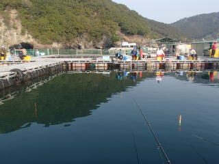 | 春休みで名古屋へ帰ってくる息子のおかずと一緒に釣りに行こうということになった。 普段釣りには全く行かないおかずを連れていくので、できれば陸続きの所がいいと思った。そして、あまり混み合っていない所が・・・。 そんないい条件の所なんてそうはないのだが、1軒思いあたる所があって電話をしてみた。しかし予約がもう入っているということで諦めた。店主からは、「既に予約を取ってある人に連絡したら、乗り合いでもいいと言っているからどうぞ・・・」というありがたい電話があったのだが、予約を入れた人は、たぶん貸し切りで釣りたいから予約したのだろうと思い、丁寧にお断りした。 たぶん自分が逆の立場だったら、嫌とははっきりは言いにくいが、やはりできれば避けたいというのが本音だろう。 でどうするか。福井という手もあったが、16日に今シーズンがオープンしたばかりで放流魚種も限られているし・・・ ということで、スタッフもイカダに常駐しているし、嫌な思いは少ないだろうと実に10年ぶりくらいになるが、紀伊長島の正徳丸に行くことにした。 ただ、今回その期待を裏切られたこともあったのだが・・・(/_;) 今回も前日に出発し、日付が変わった頃、紀勢大内山のインターを出た。高速は紀伊長島まで通じているのだが、エサ屋の都合でこうしたのである。 まずは、インターから見て右側にあるエサ屋を覗いてみる。すると、ボケは売り切れ、ウグイも5匹単位。 なので、もう一軒の玉城でも慣れ親しんだ方へ行ってみる。こっちの方が客もたくさんいて、ボケもあるしウグイも3匹で買えた。まあ、難点はシラサがちょい高いということだろうが、そこそこ大きめなので損した感じはなかった。 その後一般道を走って現地に着いたが、駐車場にはまだ誰もいなかった。トイレを済ませて寝袋に入る。以前より暖かくなったせいか、5時半まで眠れた。釣りの前日にしてはよく眠れた方である。 6時過ぎ頃から続々と車が到着した。6時30分過ぎからスタッフが動き始めて、まずは貸し切りの人の荷物を移動させていた。 7時少し前から受付が始まり、その後ルール等の説明とくじ引きがあり、実際に釣り始めるのは7時30分くらいであった。まあHPにもそう書いてあるのでいいのだが、朝の貴重な時間に結構ゆったりだな〜と感じてしまった。 で肝心のくじ引きだが、おかずに引いてもらったらなんと15組中2番だった。 これはいけるかも!と思ったのだが、結局はそれも虚しく消し飛んだが・・・(^^;)。一応、前に来たときには海側しか釣れなかった思い出があり、使用イカダはBCDだったが、1番の人がDに入ったので、Cイカダの海側のDイカダに近いコーナーに入った。(図の赤いポイント) ![]() タモはいつものものを持って行ったのだが、スタッフによれば、同様のものがイカダにあるというので自分のは使わなかった。しかし、イカダに常備されているタモは柄が短く、ちょっと使いづらいものだった。まあ、青物がかかったときは、スタッフが青物用のタモで掬ってくれるからいいのだが。 また、スカリはやや小さめで、特に気になるのは口が狭いこと。タモから直接投入する私のような人には使いづらそうだった。 とは言え、この日はそんなことは気にする事もなかったのだが・・・(^^;) 全員が釣り座に着き、スタッフによるエサチェックの後、店長の合図で釣り開始。 まずは甘エビで8M付近を探る。しかし、反応はない。イカダ全体、また他のイカダも同様のようで静かなままだった。エサをキビナゴに替えたら当たりがあり、でも合わせるとスカ!というのばかり・・・(-_-;) おかずのサポートにあれこれやっていて、やや真剣味に欠けていたのは否めないが、一気に食い込むという感じは全くなく、釣果は得られなかった。 一度手応えがあったが、ハリスがスパッと切られていた。フグでもいるのか・・・そんなばかな(^^;) 状況はおかずも同様で、空合わせばかり。反応がないよりはいいのだが、他のエサにすると当たらない。 そんなことをしばらくした後、おかずの竿にやっと乗ったが穂先に糸が絡んでしまう。でも魚は付いているので、糸をたぐり寄せて大ダイが釣れた。 でも釣れたのはそれだけで、反応もなくなってしまった頃、タイの放流が始まった。 Cイカダには8人だったが、入れてくれたのはスタッフが運んできたタモに2網分、1網ずつが7〜8匹だとしても1人あたり2匹程度か・・・寂しい放流である。 そのせいか、活性が上がったという感じはなく、ずいぶんしばらくしておかずが小さめのタイを釣り、私も同様のタイを釣った。しかし、スカリに入れるときに暴れて頭が逸れてしまい、手を出して捕まえる間もなく、落ちていった・・・(>_<) その後はシマアジが5〜6匹放流されたので、棚を浅めに狙ってみるが全く・・・ アタリもほとんどなくなって、一度おかずが大きく合わせたが、またハリスがスパッと切られていた。なんじゃ〜?この魚は。 10時頃に青物が放流さ