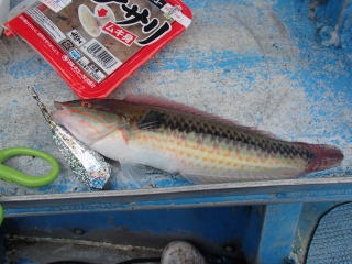 | すぎーKさんから「太幸丸を仕立てで予約したので」というお誘いをいただき、ティップラン、テンヤ、ジギング何でもありの釣りに行くことになった。 ティップランは厳しそうだが、テンヤでは良型の根魚が期待できるというのでテンヤ用のエサもしっかり準備して、いつものように前日出発で出かけた。 トイレのこともあって、気勢大内山のコンビニの駐車場で仮眠をとる。スリーシーズン用のシュラフであったが、寒さを感じることはなかった。4時過ぎには駐車場が一杯になったので、錦の港へ移動した。 ![]() 6時30分に出船というので、6時少し前に準備を始める。錦の駐車場も賑わっていて、磯渡しやら貸しボートの客で一杯だった。 すぎーKさん、ノブさん、Oさんと挨拶をして、荷物を持っていつも(夜のイカメタル)とはちがう堤防の方へ移動する。少し待っていると、先に愛海丸が来て、その後に太幸丸がやって来た。太幸丸はいつもの船長と若船長の2隻でやってきて、乗り合いの人が3人だったので、われわれはいつもの船長の方になった。 釣り座は、左舷の前から私、Oさん、ノブさん、すぎーKさんの順だった。 港から出て10分くらいの場所でまずはティップランから始まった。水深17mくらい、釣り初めの流れは緩やかで、風もなさそうだったので、追加のシンカーを付けずにバレーヒルのパープル30gでやってみる。 反応はなく船を流し直す頃から風が強めに吹いてきて、結構流されるようになり、穂先に集中する。すると、なにやら怪しい感じの反応があったが、乗らなかった。しかし巻き上げて落としなおし、巻きジャクリで止めて待つと穂先がもたれた。あわせると乗って、いい感じで1パイ釣れた。この時期にしてはやや小ぶり(330g)だったが、あまり期待していなかっただけに嬉しかった。 ![]() これはいけるかも!と思い気合いを入れてしゃくる。その頃から風も強くなり、かなり流れるようになったので、底付近をトレースできるようにシンカーを追加してやってみる。エギのカラーも変え、大きさも3号に下げたりしたが、反応はなかった。 他の人も誰も釣れないので、移動となった。移動先も水深は20m前後で、釣り初めは流れがなくても、船を流していると風が当たる場所になるにつれて流れが強くなったりして、期待をこめて釣るのだが、反応はない・・・ 次の移動で、船尾に移動してすぎーKさん、ノブさんと話していると、ジギング&テンヤに変更するというので、自分もティップランは諦めてジギング&テンヤに変更する。 テンヤを落とす前に、まずはジギングでもとやってみるが、ジグには無反応(-_-;) 数回やってみたが、ジグに反応する魚はなさそうなのでテンヤにしてみる。 エビを付けて10号のテンヤを落としてみると、やや流される時もあったが、おおむね真下に落ちていって底取りは簡単だった。さすがにエサにするとアタリがあり、穂先がよく反応した。しかし、魚が小さいのかハリに乗らず、エサだけが取られた。 テンヤは即合わせが基本だと言われるが、全然乗らないので、穂先で聞き合わせを何回かやってみる。すると、やっといい感じの手応えがあった。でも、巻き上げてくるとちょい軽い感じ(^^;) 釣れてきたのはベラだった。 ![]() その後、底が岩場の場所に移動し、根掛かり注意と言われたが・・・うまくかわせずテンヤをロストした。10号がなくなったので、8号で釣ることに・・・深い場所では30m近かったので底取りが心配だったが、なんとか8号でもやれた。 エビで釣ってもなかなかハリに乗らないので、イカに換えてやってみる。アタリがあってもすぐにはあわせず、根掛からないギリギリの感じで待つと、やっとハリに掛かった感じ(^_^)v この日一番の手応えを感じながら巻き上げると、アカハタが釣れた。30cmの良型であった。 その後、テンヤで狙える根魚のポイントを終了まで何回か流してくれた。 テンヤだと、ハリに乗らないことが多いものの、アタリは頻繁にあり、それなりに楽しめた。 1匹目のアカハタを釣ってからしばらくして、2匹目がやっと釣れた。最初、根掛かり!?かと思ったが、巻き上げると上がってきたのでよかった。2匹目も30cmの良型だった。 時折、イカは?と思ってティップランを未練がましくやってみたが、予想通りアタリは全くなかった。 10時を過ぎる頃から、潮止まりなのかアタリが止まってしまった。しかし、11時くらいには、またアタリが復活し、それまでと同様にしばらく待ちながら、また少し送り込んだりとやり取りしながら、3匹目が釣れた。これも30cmの良型であった。 11時30分に終了となり、12時頃に帰港した。 ![]() お天気は最高で、もう少しイカが釣れたら・・・と思ったが、久しぶりにアカハタが釣れたのでよかった。 企画から手配までしてくれたすぎーKさんに感謝の1日であった。 PS 午後便はイカがもう少し釣れたようで、1日通しでやればよかったかな・・・な〜んても思ったが、それは結果論で、1日やっても、やっぱ同じと