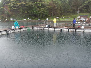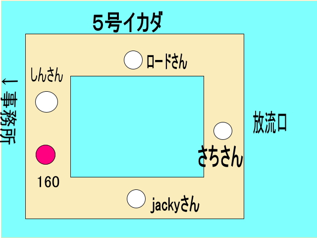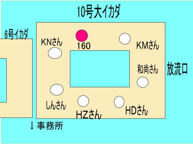 | 前回釣り堀に行ったのは2017年だった。 それ以後、あれこれ事情があって釣り堀にはご無沙汰であった。今年は行こうと思っていたら、なんと、新型コロナウィルスの感染爆発と外出自粛を伴う緊急事態宣言で行きづらい状況に・・・いや釣り堀だけでなく、釣りそのものも行きづらい状況になってしまった。 そんな中、4月上旬の釣行に滋賀のロードさんからお誘いをもらっていた。しかし、在宅勤務が推奨されるなど外出を極力控えるようにという世の中の雰囲気になり、お断りした。 ステイホームといわれたGWも終わり、緊急事態宣言は延長されたものの感染の拡大は緩やかになり、ちょっと状況が変わってきた感じがする中、また滋賀のロードさんから今度は5月の釣行のお誘いがあった。 人数集めにお困りの様子であることと、緊急事態宣言も一部の都府県を除いて解除の見込みになったこともあり、久しぶりに参加しようかということになった。滋賀の方々に久しぶりにお会いできるのも楽しみだし・・・ ![]() 昼からの2部なので、当日の集合時間は11時ということであった。それに合わせて8時くらいに家を出る。普段と生活のパターンが変わらないので、寝不足もなく体は楽である。 大雨予想の予報通り朝から雨で、交通事情も考えて高速で一気に行った。今月末まで、外出自粛に合わせて休日のETC割引がないのは痛かったが仕方がない。そのため途中のエサ屋に寄れないので、シラサと虫エサは前日に職場からの帰路の途中にある釣具店で買っておいた。 道中、大降りではないものの、霧雨みたいな状態であった。 10時30分過ぎに現地に到着した頃には、雨も上がり、「予報は外れて、案外いい日かも。」と思ったのだが、11時頃には強い雨が落ちてきて、結局最後まで強弱はあるものの、止まなかった。おかげで、ヤッケの下に付けていたウエストバッグが濡れて、大きなダメージはなかったが、携帯やら財布やらはかなり湿っていた。 集合時間ちょい前に待っていると和尚さんが到着し、ご無沙汰の挨拶をするのだが、「ロードさんがアクシデントで来られなくなった。」という悪いニュースが・・・しかたなく、急遽減った人数でイカダを変更してもらい、10号大イカダに7人となった。じゃんけんの結果私は5番目で、以下の位置になった。 ![]() 午前の部が11時30分に終了するのに合わせて、土砂降りの中イカダへ移動する。じゃんけんで上位になった人の場所決めを待って、空いていた沖側に入る。 午前中の人に聞くと、事務所側が良かったらしいが・・・午後は如何に?潮は変わるものの、小潮回りであまり動かないだろうし・・・ コロナウィルス感染の影響か、たんに悪天候だからか釣り堀全体は空いていて、午後は3〜4イカダのみ使用だった。 タナは5〜6mと聞いているので、まずはキビナゴで様子を見るが反応はない。しばらくして和尚さんとHDさんがタイを釣り上げたが、他は全くダメだった。12時少し過ぎに1回目の放流が行われて、タイが放流された。 少しは変化があるのかと思いきや、誰にもアタリはない・・・(>_<) とりあえずウキ仕掛けにエビのむき身(自作味付け)を放置したまま、ヘチ竿に虫エサを付けて5mくらいに落としてみる。すると、やっと穂先にコツコツという反応が!ドキドキしながら食い込むのを待つが、反応がなくなり、巻き上げるとエサがなくなっていた。 すぐにまた同じ事をすると、同様なアタリはあるものの合わせても掛からない。ハリがマダイの11号だったのだが、イシダイを想定してチヌ3号にサイズダウンしようと結び直していると、放置してあったウキ仕掛けが引き込まれて穂先まで海面に突っ込んでいる。(^O^) 慌ててヘチ竿を置いてウキ仕掛けの竿を巻き上げると、今日初のマダイが釣れた。釣ったというよりも勝手に置き竿に釣れたという感じだった。 ![]() マダイをスカリに入れて、ヘチ竿のハリを結び直して落としなおすとまだ反応がある。今度はグッと穂先が入ったので、合わせるといい手応え!ゆっくり上げてくると予想通りシマシマの魚体が見えてきた(^_^)v やや小ぶりだったが、イシダイが釣れた。 でもそこまでで、魚の反応はなくなりその後はひまひま状態で、青物でもと活きアユや活きアジを入れてみるが、無反応。時々釣れているのは対面の人ばかり・・・とは言ってもそれほど釣れていたわけではないが。 それから2回目の放流までは、全くアタリもなくどうしようもない状態であった。 14時過ぎに2回目の放流がやってきたので、青物狙いにまた活きアユ&活きアジで狙うも、無反応・・・ たま〜にウキがぴょこぴょこするが沈みきらず、合わせても手応えはなかった。釣れ残りのサクラマスが引っ張っているだけのようだった。 こうした中、対面では放流されたシマアジが数枚上がっていた。 どうしようもなく時間だけが流れていき、相変わらず大粒の雨は落ちてくる。少し寒さも感じるくらいだった。変化が表れたのは15時過ぎだった。エビのむき身
