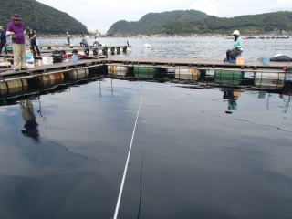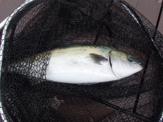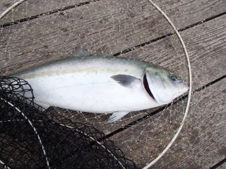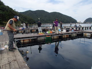 | 5月にレインボーに行ってから、次に行ける機会を探っていたのだが・・・4・5月は在宅勤務で本来の仕事ははかどらず、その影響で6月以降は例年以上に多忙で行ける状況ではなかった。 また、7月に入ると新型コロナウィルスの第2波で外出そのものがはばかられる状態になってしまった。 感染状況の落ち着いた8月下旬に、重い腰を上げて半夜のイカ釣りに行こうと準備していたら・・・高校以来の付き合いである先輩の訃報(1年ほど前に急に癌が見つかり、闘病していた)があり、結局時期も逸してしまった。 そうした頃、また滋賀のロードさんから誘いのメールが届いた。結局、自分一人で出かけるのに腰が重くなってしまって、このまま休眠のままになってしまうのを避けるため、参加をお願いした。 4連休の二日目に2部の4イカダを貸し切っての釣行ということで、結構大がかりな釣り会だった。しかし、事前にイカダの号数とメンバーは割り振られており、私は5号にロードさん、しんさん、jackyさん、さちさんと一緒に5人だった。かっての電脳爆釣団で知り合った人ばかりで、本当に何年ぶりという再会の場が用意された。 11時集合と言われていたので、当日は8時頃に家を出る。シラサと虫エサは買っていないので(近所に釣具屋がなく、出勤日なら帰路で買う店はあるのだが・・・)高速は木之本で降りてエサ屋に寄る予定であった。しかし、名神が渋滞しており、ロードさんに電話して買っておいてもらうようにお願いした。 それで途中で高速を降りることなく、一気に若狭三方まで行ったらなんとか10時30分くらいにはインターを出ることができた。ここからならあと10分もあれば到着できると思っていたら・・・ なんとレインボーラインの入り口付近から700〜800mの渋滞。しかも全然動かなくなってしまった。 どうしようと、ふと前を見ると滋賀ナンバーの高級車。ひょとして和尚さん?(笑) しばらくして、和尚さんも私に気がついて降りて挨拶するとともに、打開策を協議。反対車線に出て一気に止まっている渋滞の車を追い越す作戦にしようということになった。 私一人だとちょっとためらわれたが、和尚さんの高級車の後ろなら対向車とトラブルになっても大丈夫だ(笑)と後ろを付いていった。いわゆる「コバンザメ」作戦である(*^_^*) 途中1〜2台対向車があったが、なんとかすれ違って行くと、思った通りレインボーラインの入り口から渋滞は続いていた。それを横目に日向湖の方へ行くと、後は何事もなくレインボーに到着した。やれやれである。ただ、レインボーの駐車場が一杯で、なんとか一番遠い場所に空いていたスペースに駐車した。 ![]() 事務所へ行くと、既に到着していたjackyさん、さちさんと久しぶりの挨拶をする。お二人と釣りをするのは何年ぶりだろう??ってくらいに久しぶりだった。 11時30分に1部が終了するのだが、その頃にはロードさんも到着したが、しんさんだけがまだ着かず・・・でもじゃんけんで場所決めをして、私は上記の場所になった。 ![]() すぐに仕掛けを投入し、様子をみると待望のアタリが!でも、合わせどころがないまま反応がなくなりエサもなくなっていた。すぐにエサを付け替え、今度は十分だとあわせると・・・何か変?底網に根掛かりしたのだったのだが、どうも外の魚がいたずらをしていたようであった。 その後は棚を浅くしたのもあったが、反応はなく1回目の放流を迎えた。 潮が澄んでいて、4〜5mくらいまで見えてしまうので、真ん中底を狙い直す。すると反応があって、今度はちゃんとした手応えで大きめのタイが上がってきた。すぐに同様のことをすると、また反応がありまたタイが釣れた。 ![]() しかし、その後の反応はなく・・・水面を見ると、見える棚に青物が回遊している。反応しないかとあれこれやってみるが、素通りだった。ふとスカリの中を見ると、タイがひっくり返っている。水温が高いのが原因なのだろうが、とりあえず絞めてもらうために一時休憩にした。ついでに、車を事務所に近いところに移動して大きめのクーラーを下ろして、絞めてもらったタイを入れておいた。 その後は全然反応がなく、何をやってもダメだった。時折、タイや青物が見えるところに回遊してくるのだが、やはりどうにもならず・・・出るのはため息ばかりだった。 今日の5号イカダはハズレのイカダだったみたいで、他の人も厳しい状態だった。一番釣れたのはしんさんだったが、それでもツ抜けがやっとくらいだったような・・・ 青物放流の後、活きアジで狙うが反応はなく、jackyさんが大きなヒラマサを釣っただけだった。青物は追ってくるが、活性は全然上がらず手も足も出ない状況だった。 反対に周囲のイカダは活性が良く、歓声が聞こえ、皆さんよく釣っていた。私たちの5号イカダは、魚の数が極端に少ないわけではなさそうだが、食い気のある魚はほとんどいない感じだった。 15時近くにシラサを真ん中よりやや右寄りに落として待っていると、待